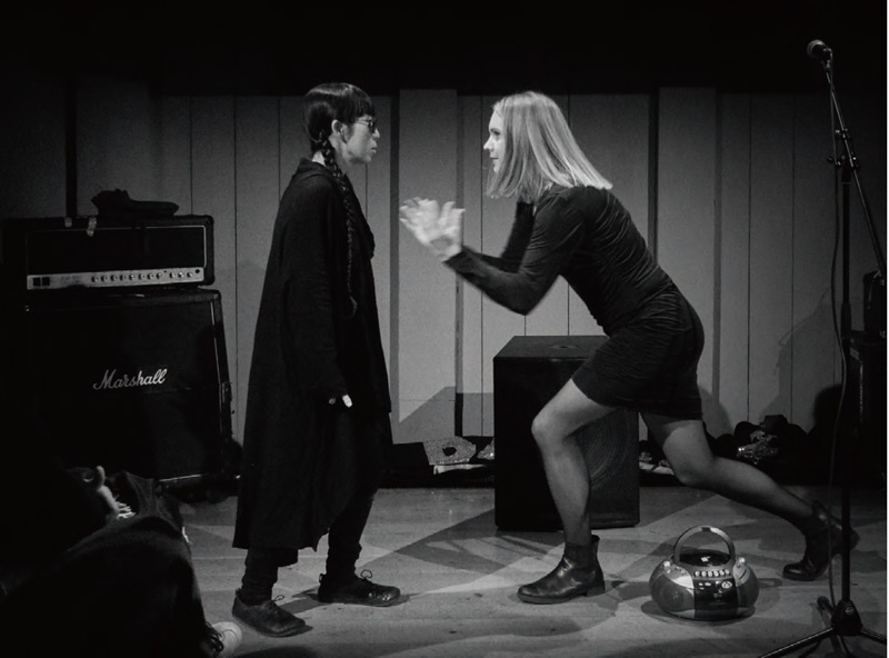 make a good songbird and demonstration of the relation between a master (Maria on the right) and a bird in cage (Miyuki on the left). We used time-stretching technique, which we usually use for editing audio, in order to make it possible for human (me) to imitate the bird sound and to express bird-time.