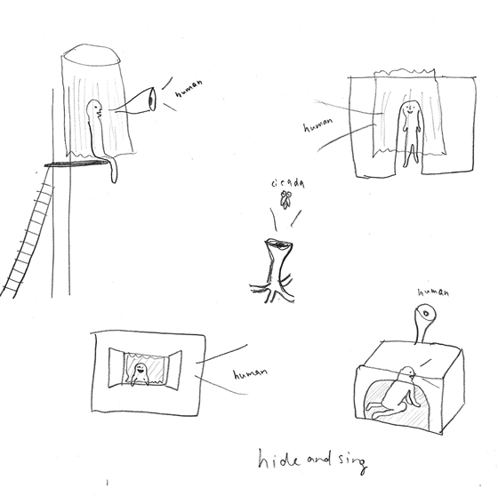 It is a project to make several types of participatory sound sculptures. The audience is invited to try unusual voices in the sculpture, which would turn into a live performance in an exhibition setting. One sculpture would be like a recording cocoon or like a karaoke helmet. It would have a headphone to listen to cicada sound and a mic to record the participant’s voice. As an exhibition setting, there would be several sculptures and speakers that mixes and accumulates everyone’s voice synched with the cicada. This project goes back to a time when I got a shotgun mic in my bachelor study, which enabled me to focus on a single cicada. Normally cicadas are appreciated if it is far away, and if they are like a crowd in the background. It would be too noisy if it were singing next to us alone. The microphone enhanced my hearing. The single cicada sounds inspired me and I started imitating it, which freed my voice.